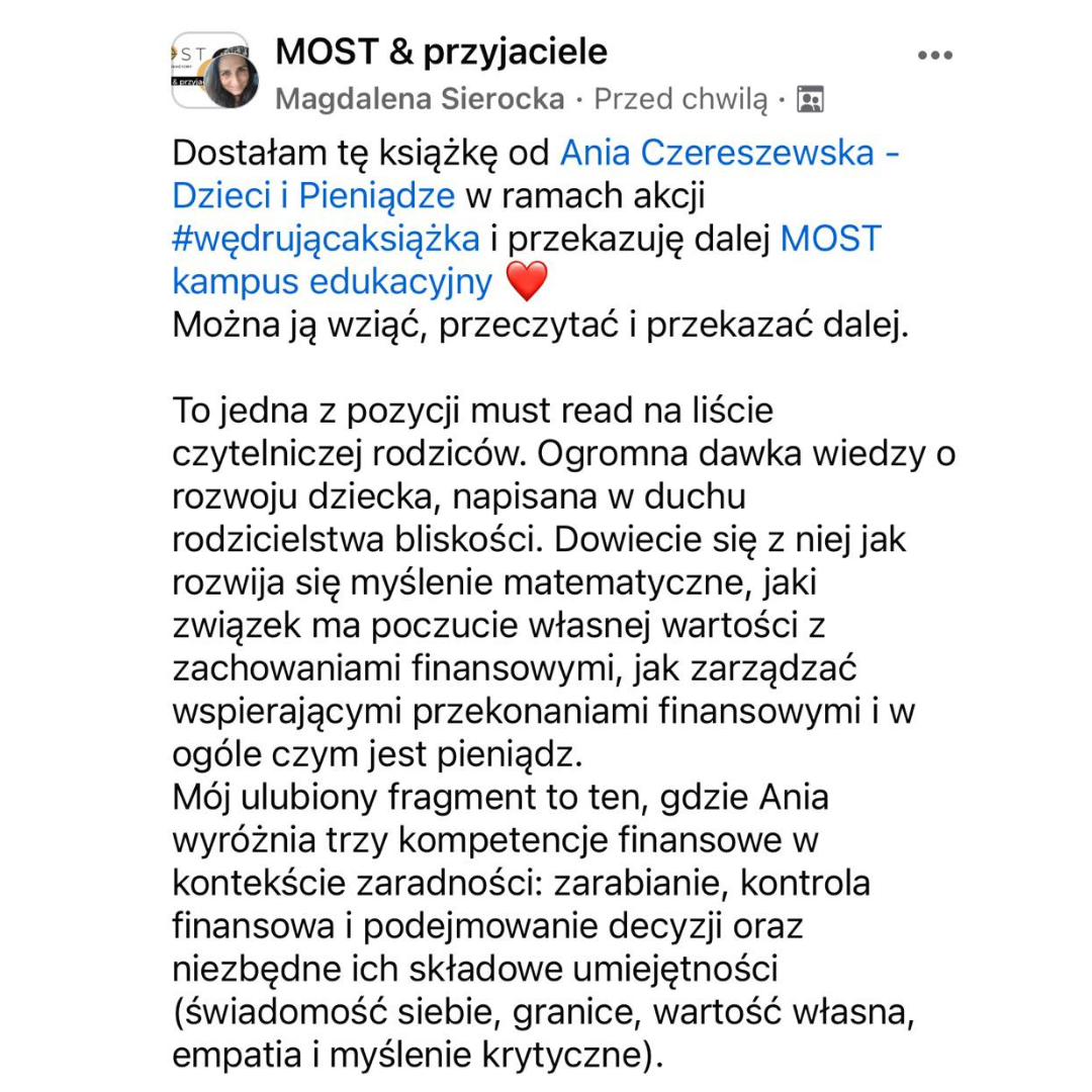 „Jak wychować dziecko zaradne finansowo?” to przewodnik dla rodzica, który rozumie, że pieniądze są częścią świata i jednocześnie chce, by dziecko umiało budować relacje, nie stało się materialistą, by po prostu umiało traktować pieniądze jako narzędzie do budowania dobrego życia. Książka prowadzi przez trudne tematy finansowe z lekkością i wyrozumiałością, tak, by nawet bez rozbudowanej wiedzy ekonomicznej można było rozmawiać o pieniądzach z dziećmi.”